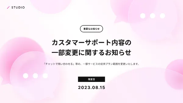 2023年8月15日より、STUDIOご利用中のご相談について、有人による調査・ご案内を有料プランご契約中プロジェクトに限定させていただきます。